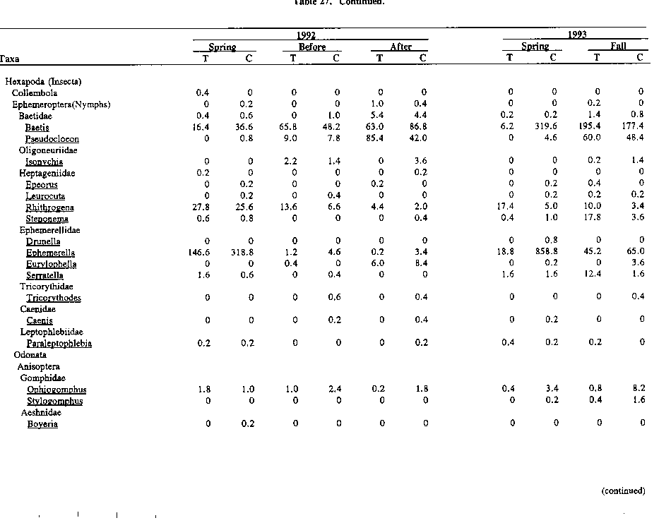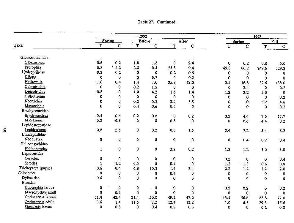 Table 27: Mean number of organisms from 5 samples taken by kick nets in riffle communities in the Brule River (Lake Superior) in 1992-1993 in areas that are periodically treated (T) and in areas that are not treated (C). Samples were taken in the spring and before and after application of lampricide in 1992, and spring and fall of 1993.