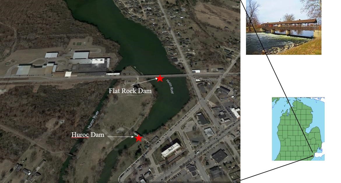 The Flat Rock and Huroc dams are located on the Huron River, MI and are the first significant fish passage barriers upstream from Lake Erie. The Flat Rock Dam is located immediately upstream of the West Huron River drive bridge/railroad bridge and has other infrastructure, including an oil/gas pipeline associated with it. The Huroc Dam is a low head dam just downstream of the Flat Rock Dam.